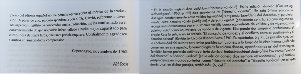 The fact that Carrió’s translation of ORR is not mentioned at all in the introduction or in the explanatory note is something that is worth mentioning. In my opinion, the 1963 translation – which was also based in terminological choices Ross himself approved – could have helped a lot to translate this new English version in a more appropriate manner, being that it was the only one of several translations of ORR that was able to capture the intentions of Ross while developing his theory of legal norms.